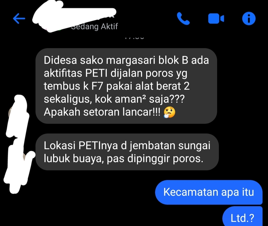 “Didesa Sako Margasari Blok B ada Aktifitas PETI di jalan Poros yang tembus ke F7” Bebernya Rabu (23/04/2025) sore, melalui pesan mesengger.