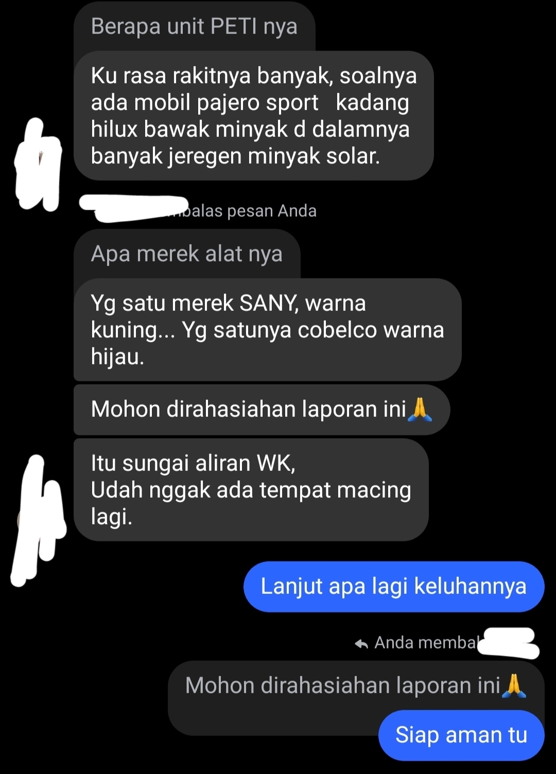 Terakhir dirinya berharap agar aktifitas tersebut di hentikan karena berdampak buruk terhadap lingkungan khusunya aliran sungai WK yang biasanya sebagai lokasi mancing warga setempat.