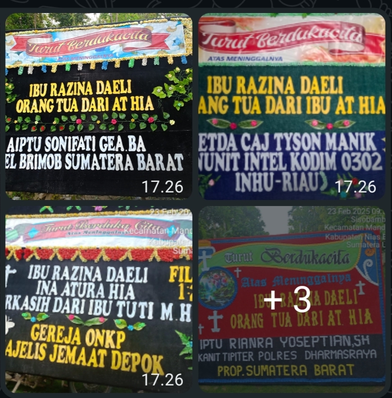 Ucapan datang dari, IPTU SONIFATI GEA (INTEL BRIMOB SUMBAR), LEDTA CAH TYSON MANIK ( DANUNIT INTEL KODIM 0302, INHU-KUANSING), GEREJA ONKP MAJELIS JEMAAT DEPO, IPTU RIANDRA YOSEPTIAN, SH ( KANIT TIPITER POLRES DHARMASRAYA, SUMBAR) KASUBDIT KAMNEG DITINTELKAM POLDA RIAU (KOMPOL INDRA LAMBAT, S) PRK MADE MAIZAL (AU). Masih banyak lagi ucapan yang diberikan bahkan ada yang sempat tidak ter pesan papan bunga.