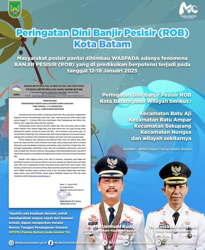 Rudy juga mengimbau masyarakat di kawasan pesisir, seperti Batuaji, Batu Ampar, Sekupang, dan Nongsa, agar meningkatkan kewaspadaan terhadap potensi banjir rob.