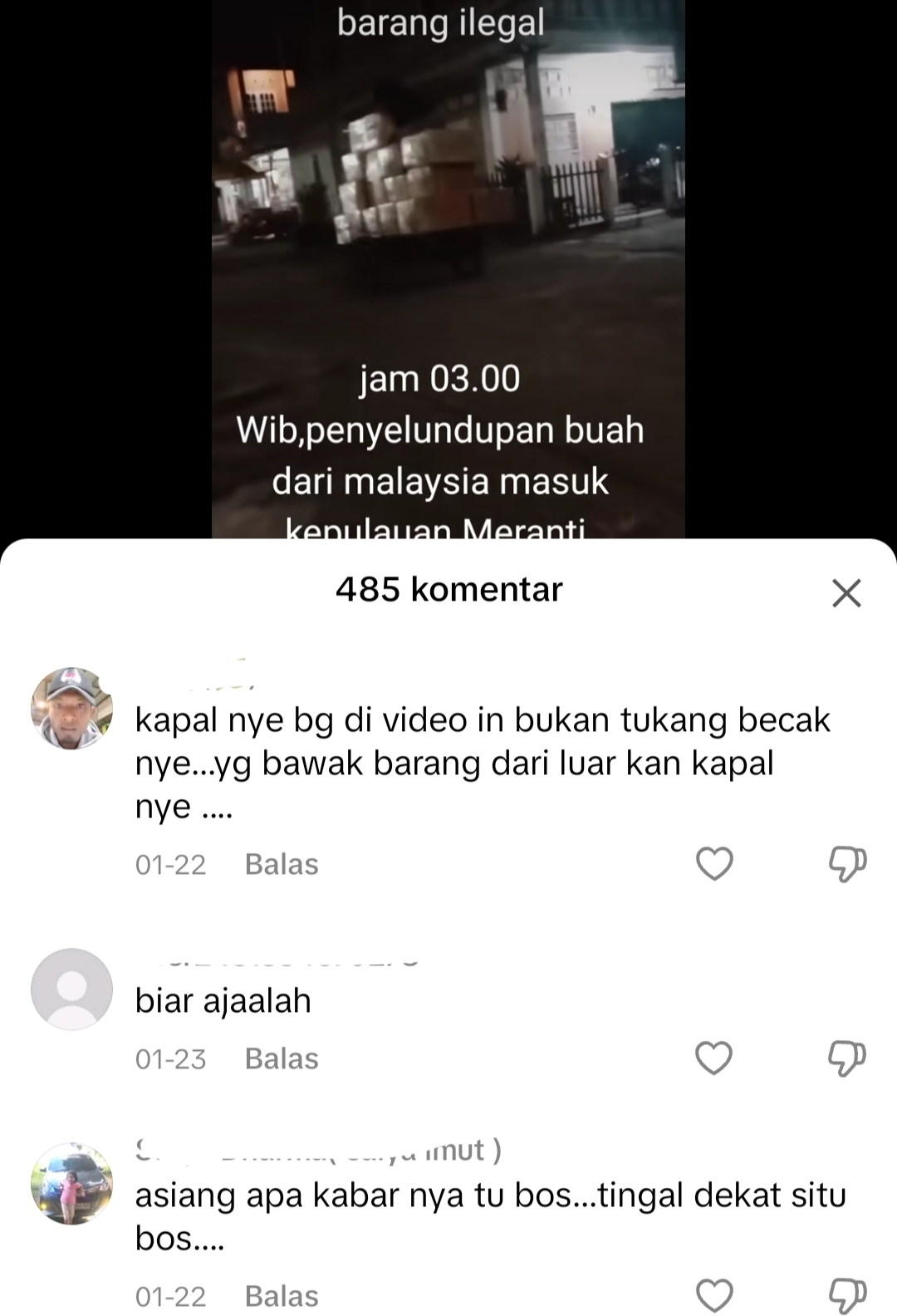 Posmetroindonesia.com–Meranti|| Sebelumnya sempat viral psotingan di media sosial TikTok dengan akun @Impal (Kopiisusuuuhh) pada Rabu 22 Januari 2025 lalu, peristiwa sekitar pukul 03.00 dini hari itu di duga sedang melakukan pengangkutan ratusan Kotak Buah Impor Ilegal dari negara tetangga Malaysia yang Masuk ke Selat Panjang Kota di Jl. Penggaram kabupaten kepulauan Meranti Provinsi Riau.