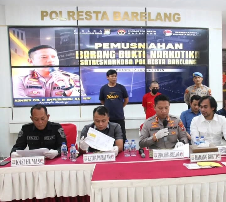 Batam | Kapolresta Barelang Kombes Pol H. Ompusunggu, S.I.K., M.Si., didampingi Kasat Resnarkoba Polresta Barelang AKP Deni Langie, S.I.K., M.H., dan Kasi Humas Polresta Barelang Iptu Budi Santosa, S.H., memimpin konferensi pers pemusnahan barang bukti narkotika jenis sabu seberat 153,06 gram. Kegiatan ini dilaksanakan secara transparan di hadapan pihak kejaksaan, pengadilan dan instansi terkait lainnya, bertempat di Lobby Mapolresta Barelang pada Jumat (17/01/2025).