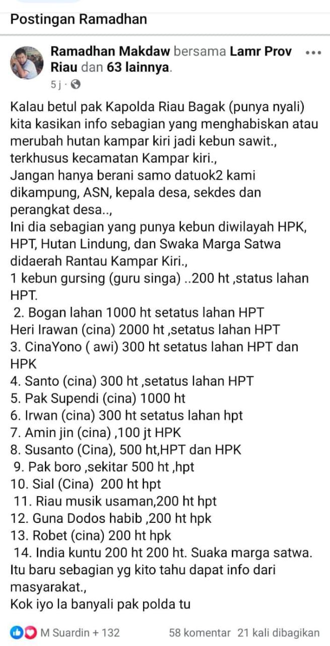 Dalam cuitannya yang dikutip dari beranda Facebook akun @Ramadhan Makdaw mengatakan “Kalau betul Pak Kapolda Riau Bagai (Punya Nyali) kita kasihkan info sebagian yang menghabiskan atau yang merubah hutan kampar kiri jadi kebun sawit terkhusus untuk kecamatan kampar kiri” Tulisnya, pada Kamis (12/06/2025)